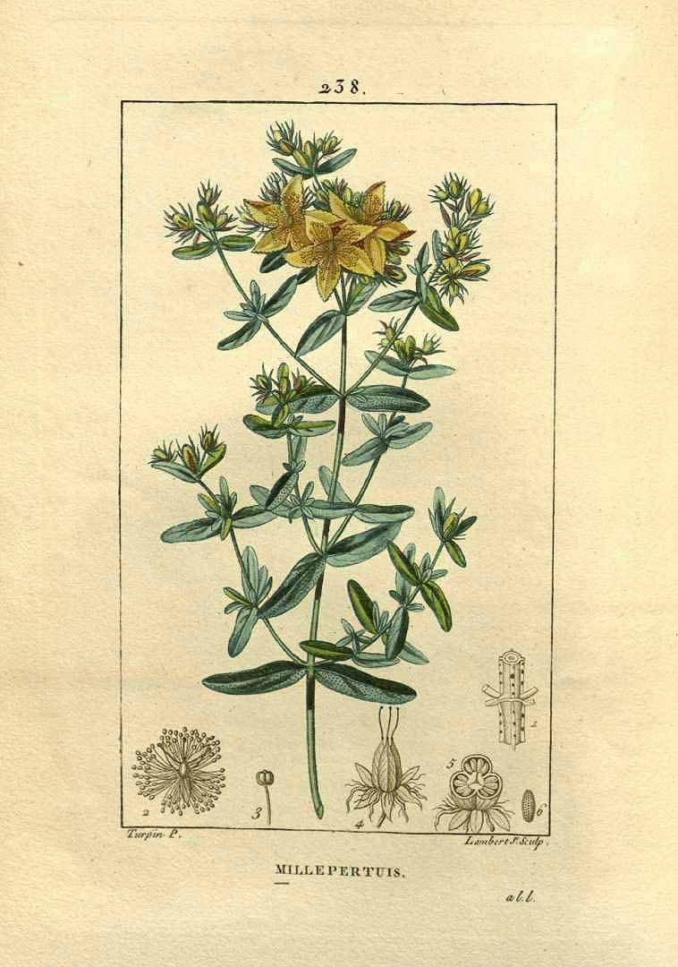 Hypericum perforatum di J. Zoon da Afbeeldingen der artseny-gewassen met derzelver Nederduitsche en Latynsche beschryvingen di Dirk Leonard Oskamp, pubblicato nel 1796.